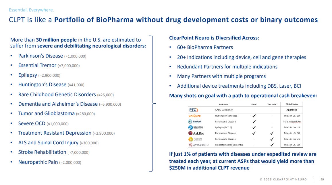 Importantly, ClearPoint’s value does not depend on picking a single winning therapy. Instead, it is the platform that enables all of them to reach the brain — with millimeter-level precision. This makes it a pure-play pick-and-shovel investment in one of the most promising frontiers of medicine: neurological intervention.